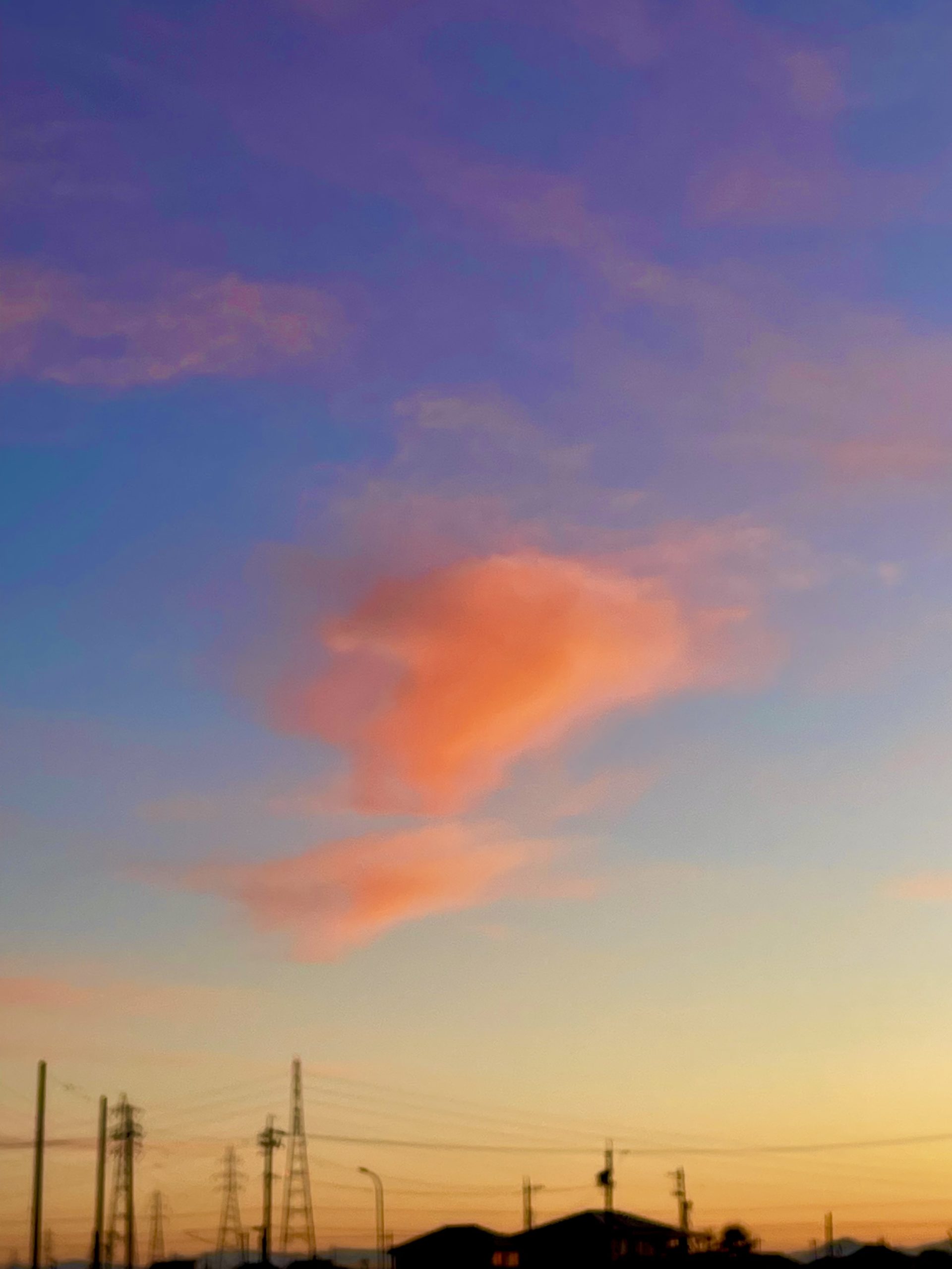 今朝、まだ少し薄暗い時間帯にウォーキングに出かけ、空を見上げたら「まぁ!なんて可愛らしい雲♪!」。ピンク色の雲はだんだんとオレンジ色になって、たちまち黄金色になって、朝陽が一気に昇りました。歩いている間中わくわくが止まらず、いつまでも雲を見ていたいので、復路はずーっと後ろ向きに歩きました(^^;;