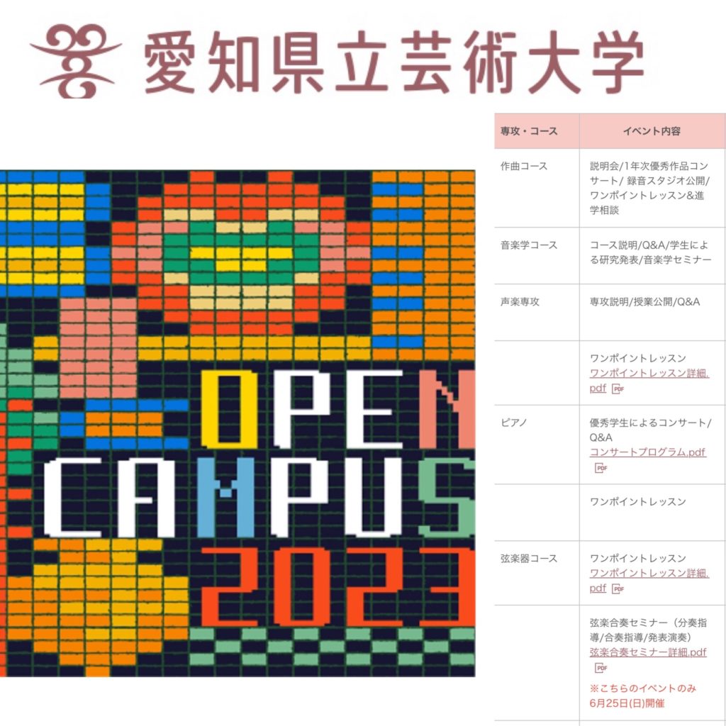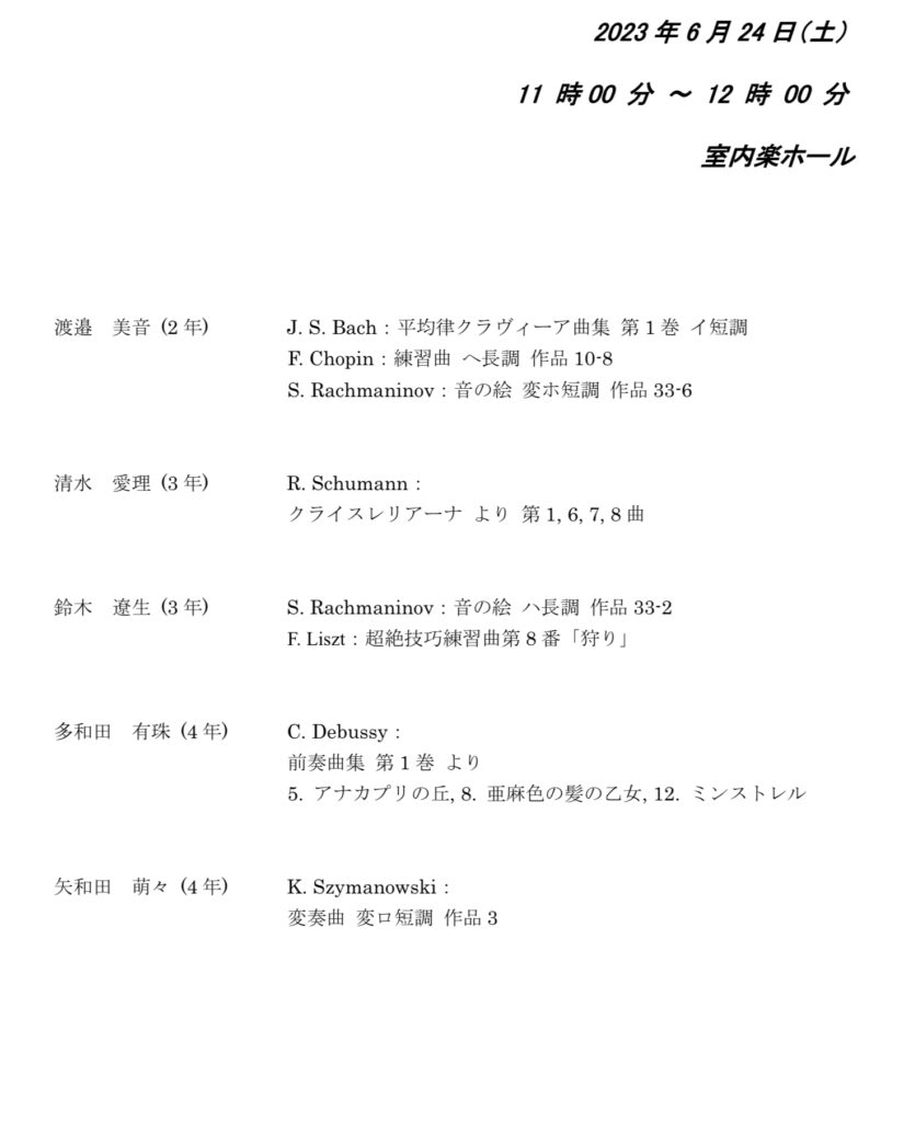 6/24(土曜日)、愛知県立芸術大学・室内楽ホールにて、優秀学生によるピアノコンサートに同大学4年生の有珠ちゃんが出演します。この日はオープンキャンパス開催中で、すでに参加予定をしている教室の高校生もいらっしゃるようですが、愛知県立芸大のオープンキャンパスに出向かれる方は、11:00〜12:00ぜひ室内楽ホールも覗いてみてくださいませ!